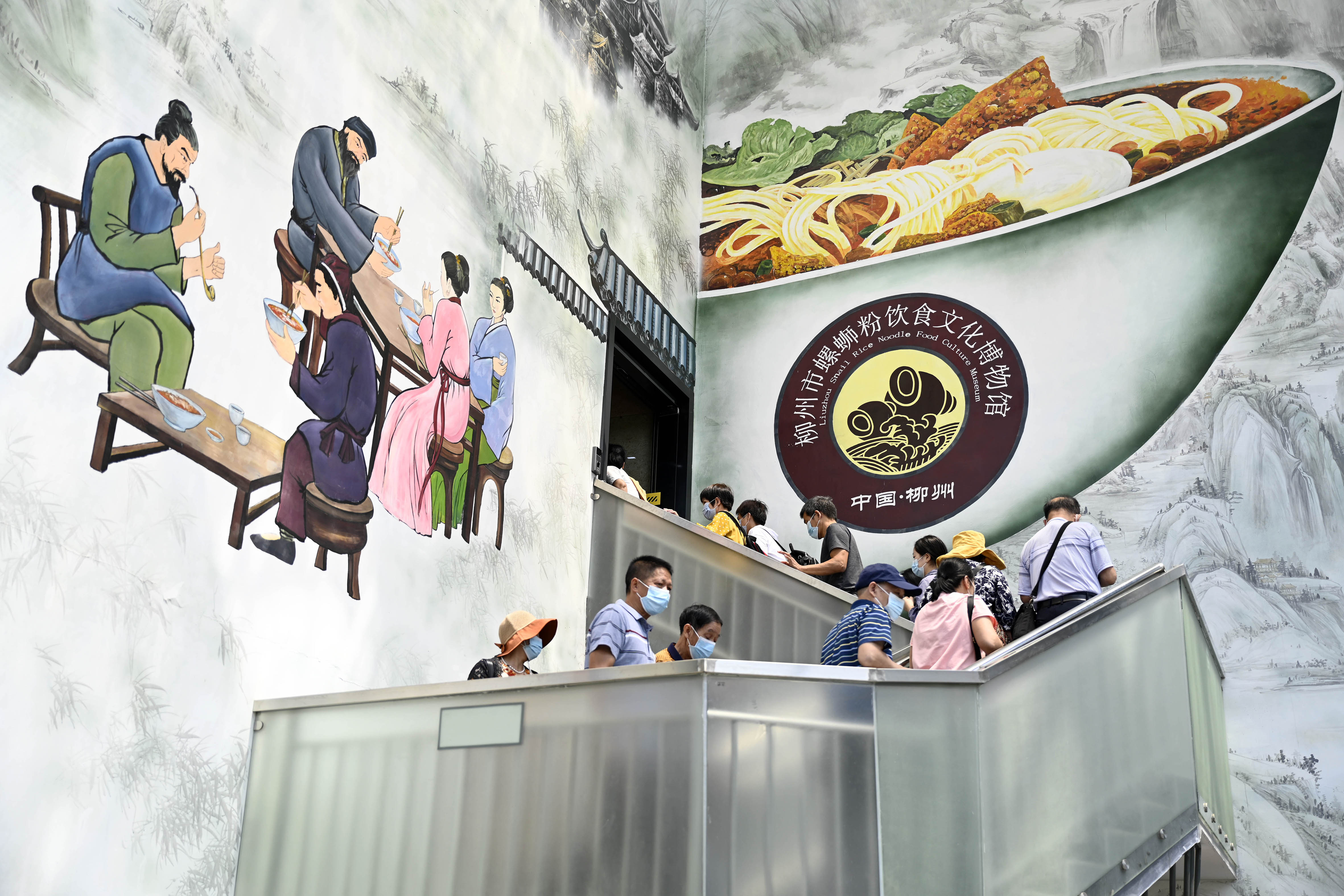 4月29日,在广西柳州螺蛳粉产业园,游客参观柳州市螺蛳粉饮食文化博物馆。近期,广西柳州螺蛳粉产业园里迎来各地的旅行团、研学团等团体入园,人们走进园中的企业和博物馆参观游览,了解螺蛳粉的相关知识。近年来,广西柳州将柳州螺蛳粉产业园打造成为集食品配套生产、电商物流配套、食品研发、工业旅游于一体的新型食品工业园,推动“柳州螺蛳粉+旅游”深度融合,走出了产业融合发展的新路子。新华社发(黎寒池 摄)