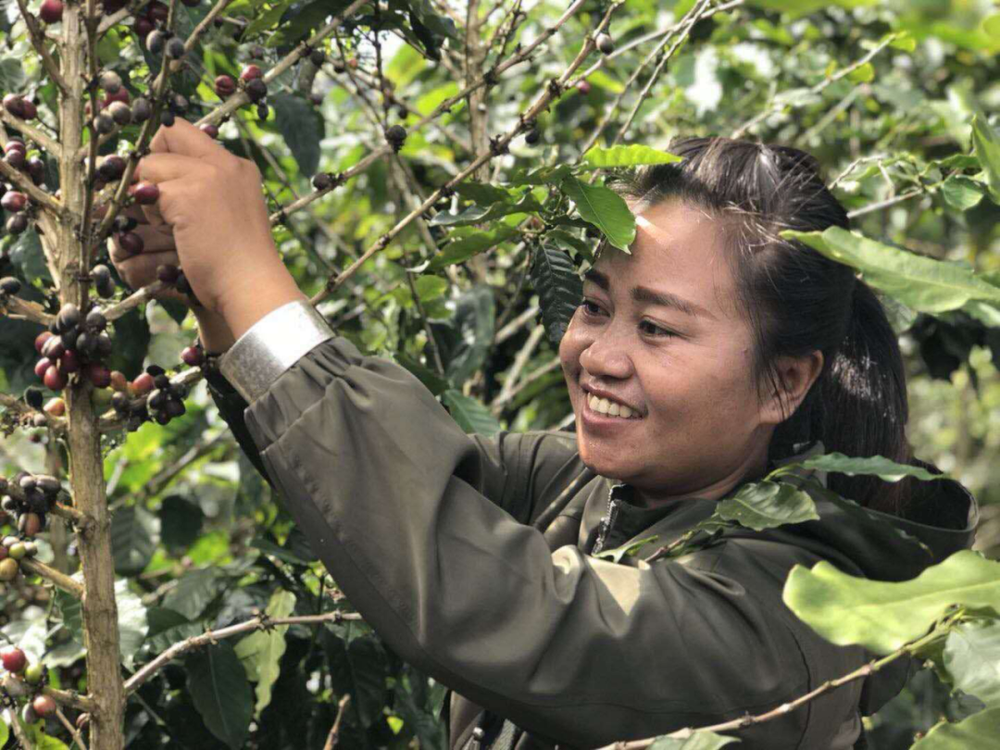 叶萍在自家园子里采摘咖啡豆。