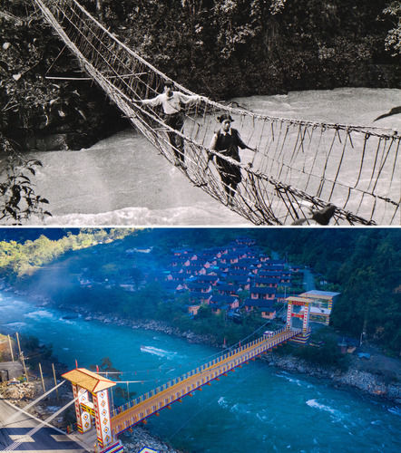 拼版照片上图:云南独龙族群众通过藤篾桥(资料照片);下图:云南独龙江乡白来感恩大桥(2020年10月29日摄,无人机照片,新华社记者胡超摄)。