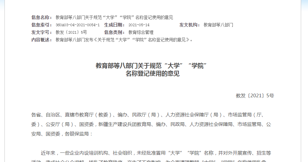 教育部发展规划司负责人介绍,近来,一些企业内设培训机构、社会组织,未经批准冒用“大学”“学院”名称,并对外开展宣传、招生等活动,造成社会公众误解,扰乱了教育秩序,产生了不良影响。