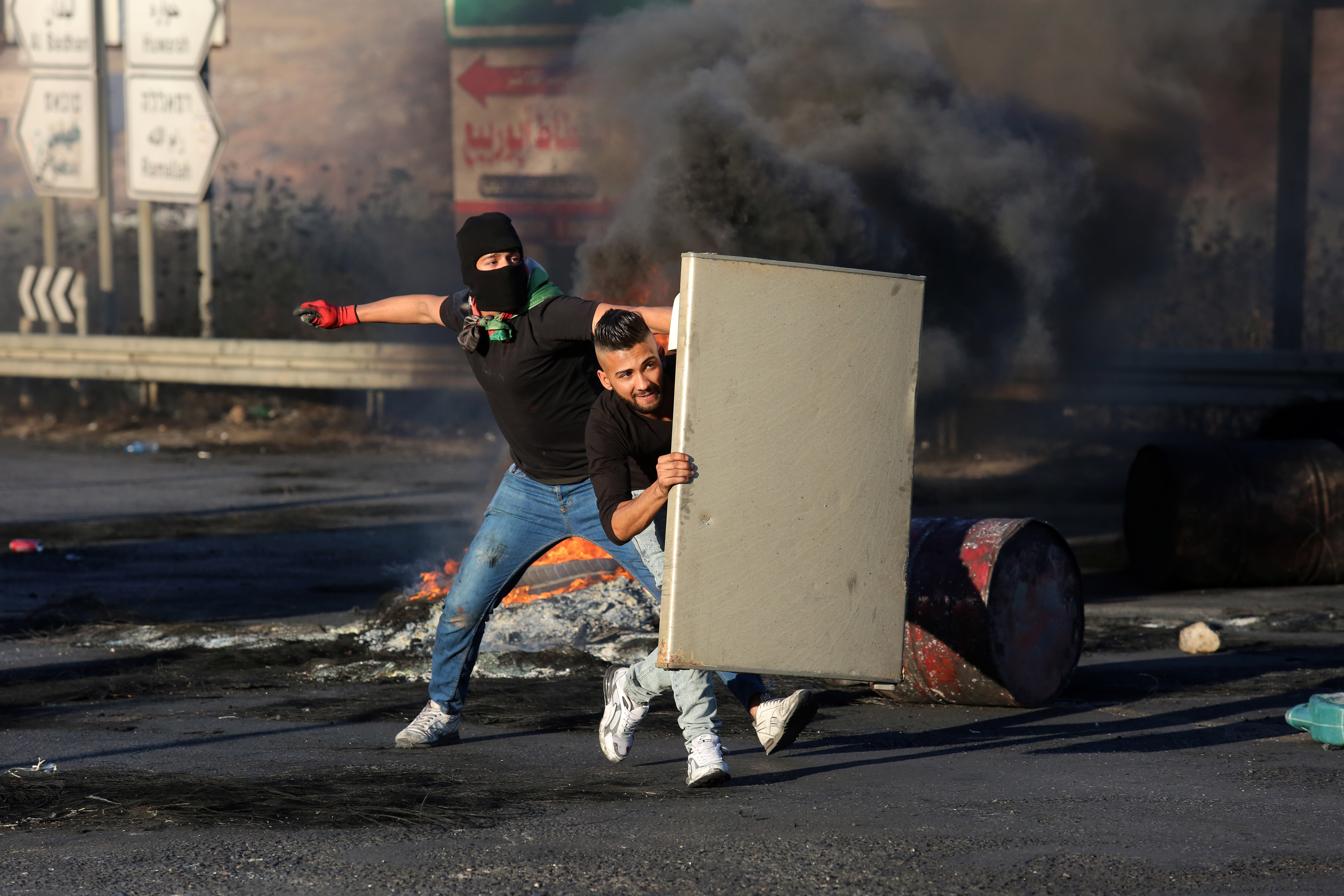 5月15日,巴勒斯坦人在约旦河西岸城市纳布卢斯附近与以色列士兵冲突。新华社发(尼达勒摄)