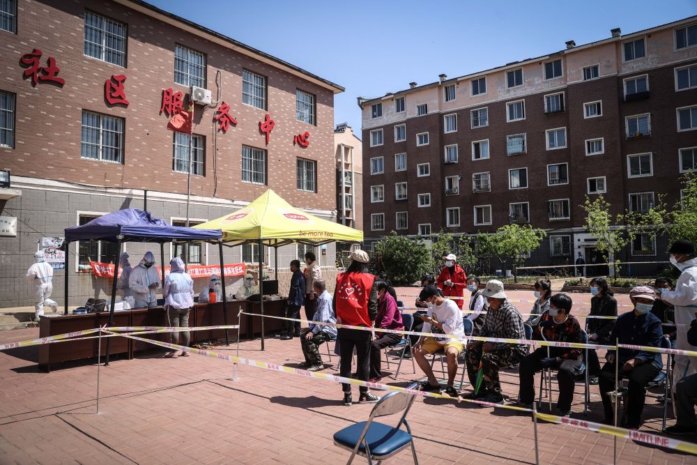 ↑5月18日,市民在营口市西市区滨海街道智胜社区服务中心核酸检测点进行核酸检测。
