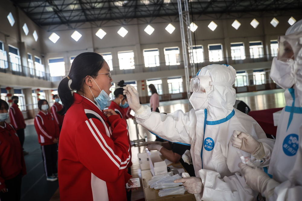 ↑5月18日,医护人员在营口市第二高级中学内为学生进行核酸检测。