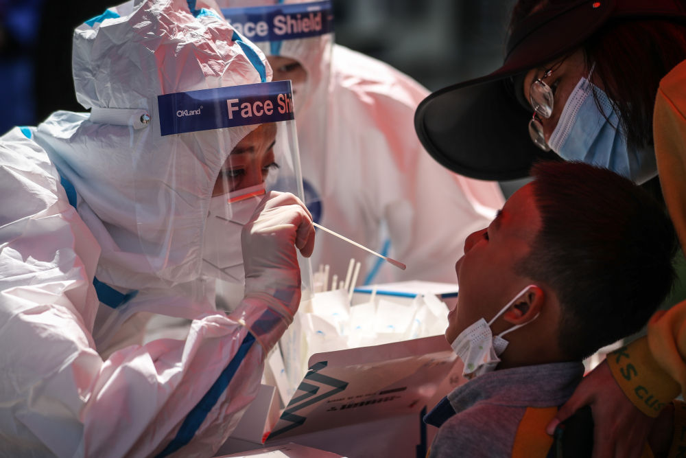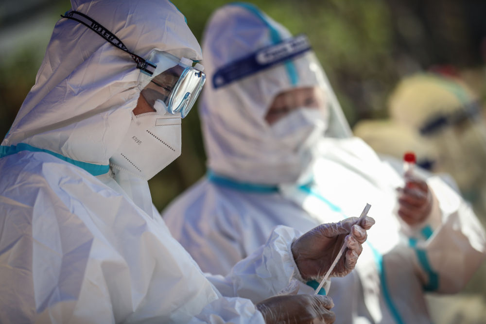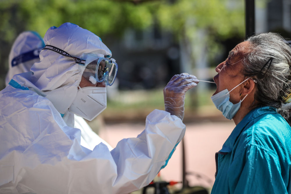 ↑5月18日,医护人员在营口市西市区新湖社区核酸检测点为市民进行核酸检测。