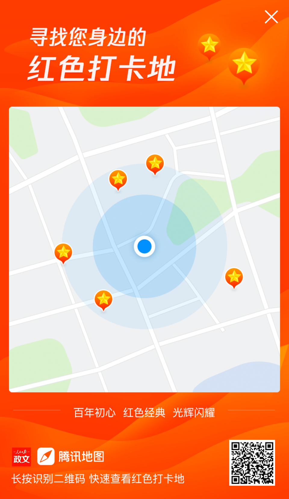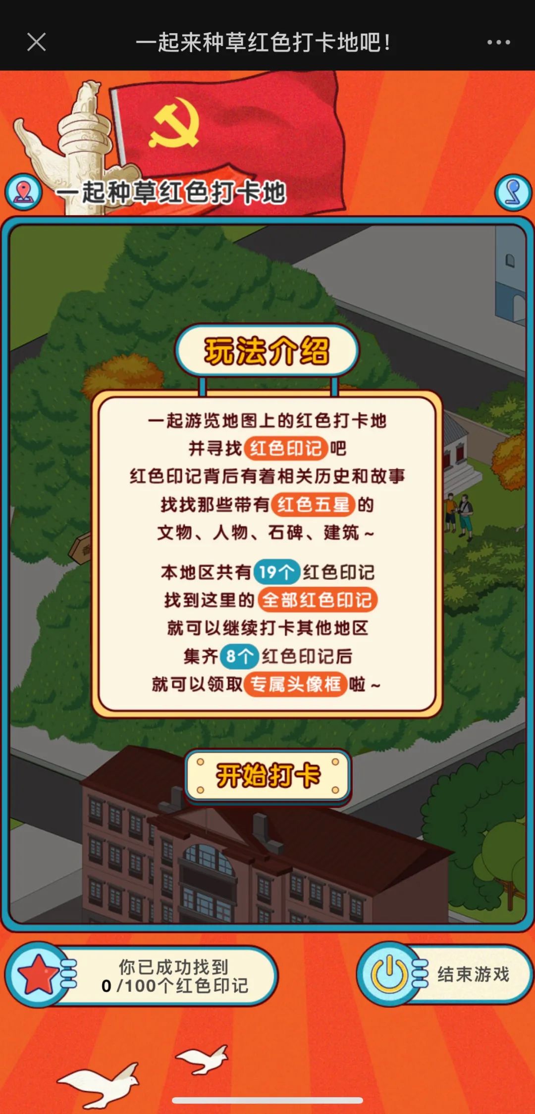 进入该地区后,可在当前地图中寻找带有红色五星的文物、人物、石碑、建筑,再小的红星也不要放过哦~集齐8个红色印记就能生成庆祝中国共产党成立100周年专属微信头像框啦!