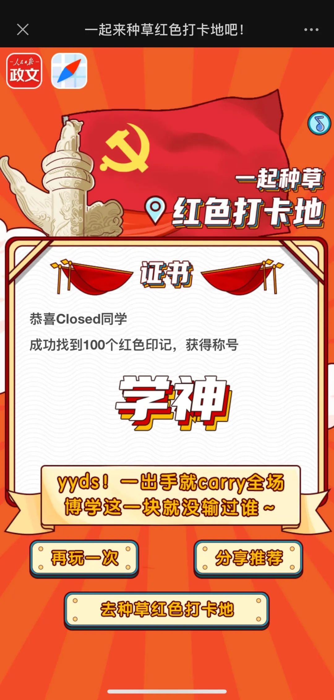 收集完该地区的红星后,就可以继续打卡其他地区了哦!听说全部打卡100个红色印记就可以获得学神证书!谁能这么厉害?