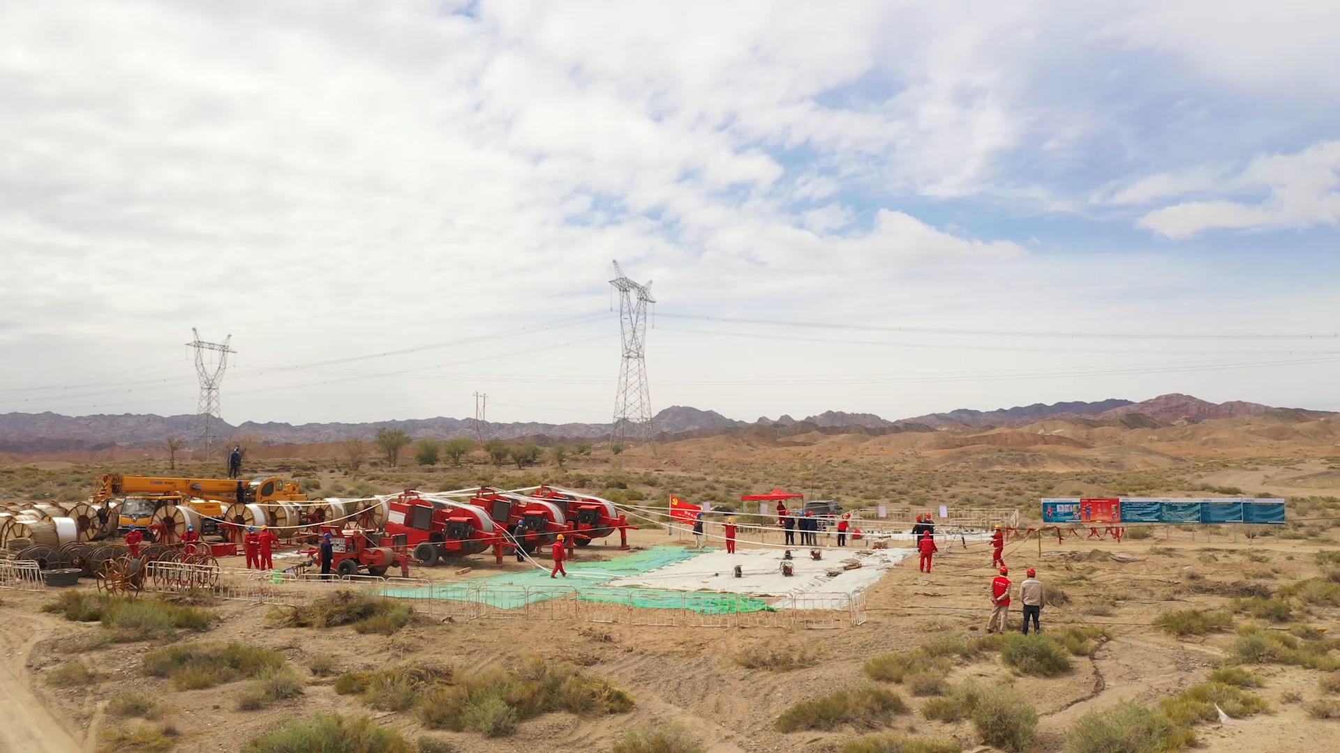 2020年4月17日,吐鲁番—巴州—库车Ⅱ回750千伏线路工程施工2标段开展张力放线施工作业(国网新疆电力有限公司谢文 摄)