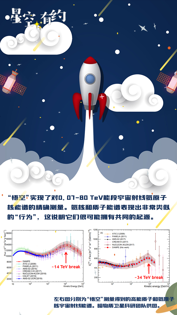 此次,“悟空”实现了对0.07—80TeV能段(1TeV=1万亿电子伏特)宇宙射线氦原子核能谱的精确测量。在前四年半的工作时间中,“悟空”共收集到约1750万个高能氦原子核数据。据此,科研团队绘制出精确的高能氦核宇宙射线能谱。该能谱清晰展示出氦核流量先上升、后下降的“拐折”结构,其中后半段的下降结构,系“悟空”首次发现。