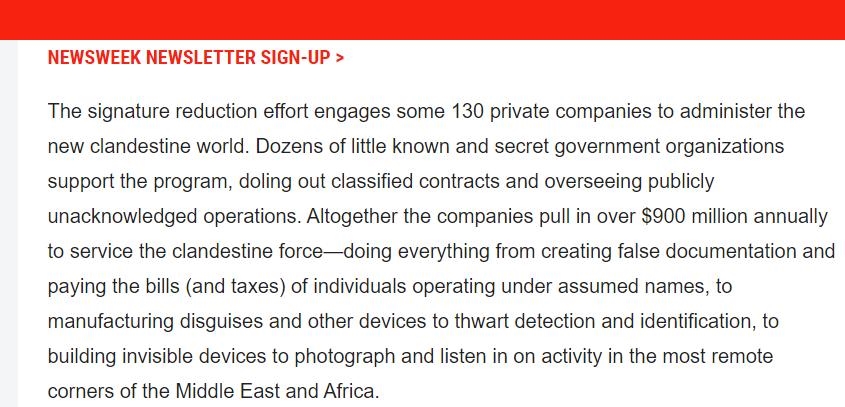 文章称,这只“秘密军队”隶属于一个名为“降低特征”(signature reduction)的项目,大约有130家私营公司参与其中。这些公司每年在该项目上的花费超过9亿美元,还有数十家鲜为人知秘密的政府组织对该项目提供支持。这些公司制造了虚假文件,支付雇员的账单和税款,以虚假名称进行经营。他们制造特种设备对包括中东地区、甚至非洲最偏远的角落进行监视。“秘密军队”成员出没于现实生活和虚拟世界,有的是军人身份,有的伪装成平民,有的在私营企业和咨询公司中任职,其中还不乏一些家喻户晓的公司。