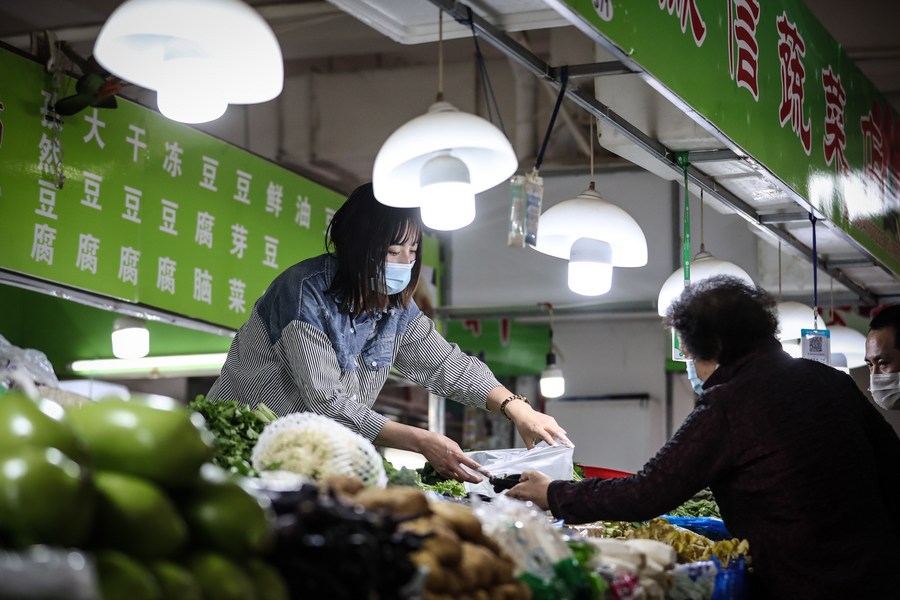 66岁的市民李萍正在购买熟食,记者问她担不担心疫情,李萍摆摆手说:“怕啥呀?现在政府管理这么严,大家防范疫情的意识也更高了,过去我们打败了疫情,这次也同样能赢!”