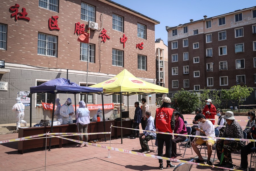 5月18日,市民在营口市西市区滨海街道智胜社区服务中心核酸检测点进行核酸检测。新华社记者潘昱龙摄
