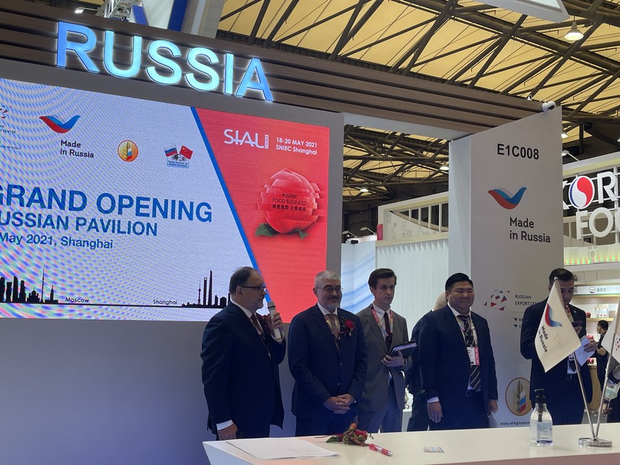 2021年5月18日,俄罗斯驻华商务代表阿列克谢·达赫诺夫斯基在中食展俄罗斯展台开展仪式上讲话。新华社记者 华迪 摄