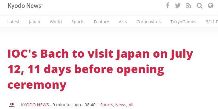 据共同社报道,国际奥委会副主席约翰·科茨19日表示,国际奥委会主席巴赫将于距东京奥运会正式开幕前11天,即今年7月12日到访日本。