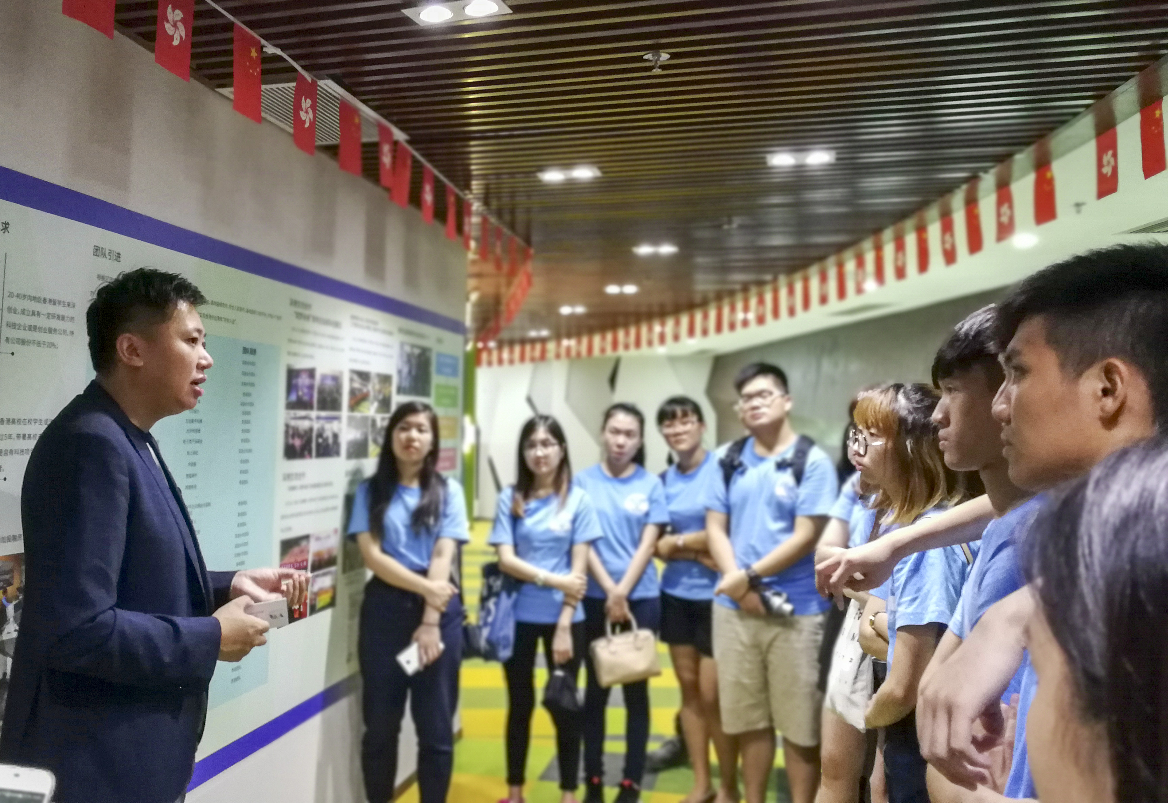 2017年8月,在内地创业的香港青年陈升(左)在深圳南山智园接待香港大学生暑假交流计划的学员时,介绍基地发展情况。新华社发