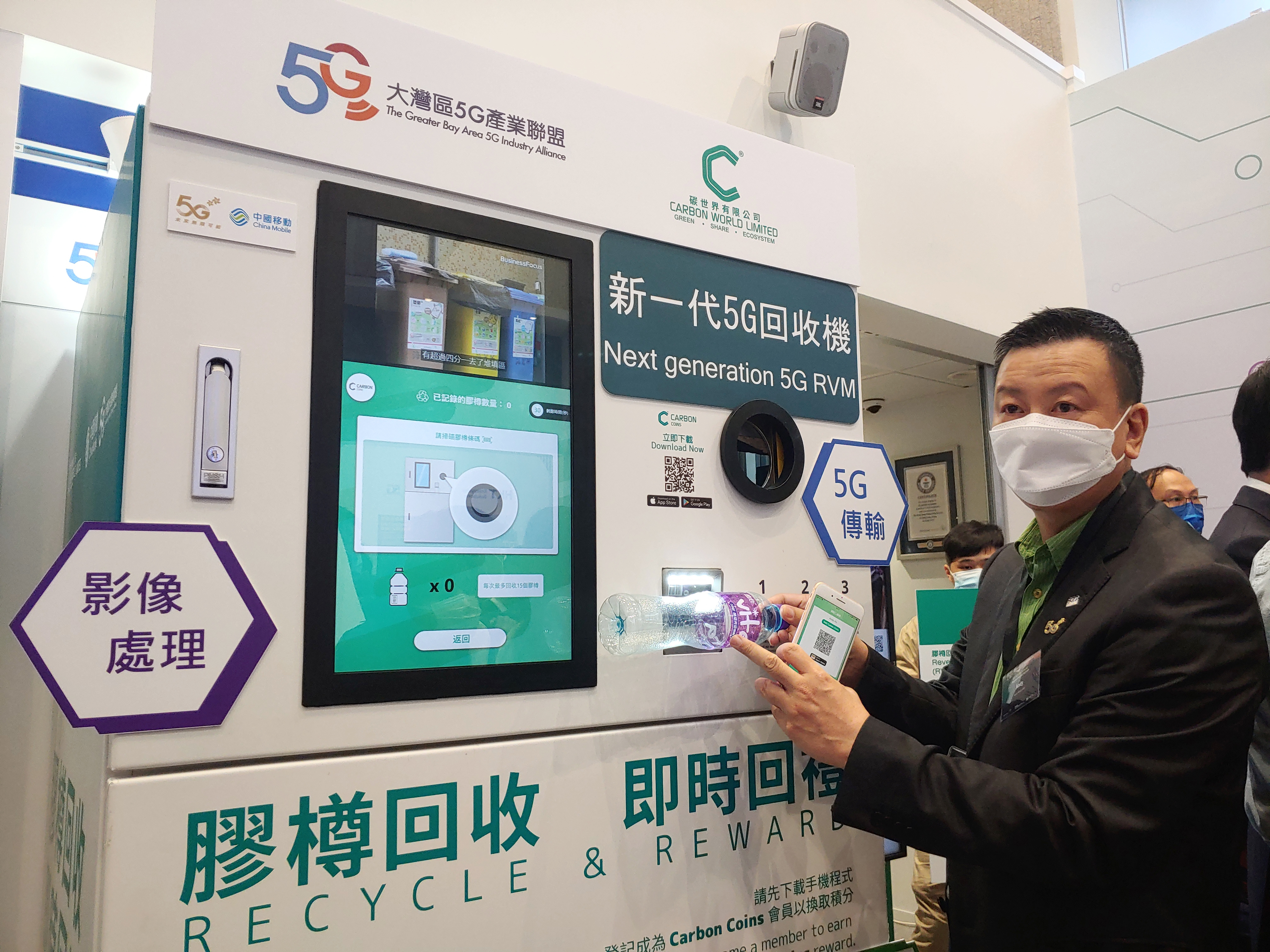 2021年4月28日,“大湾区5G产业联盟”展出一款智能塑料瓶回收机。它通过5G技术,可辨认出塑料瓶的形状,进行自动分类,方便回收处理。新华社记者 张雅诗 摄