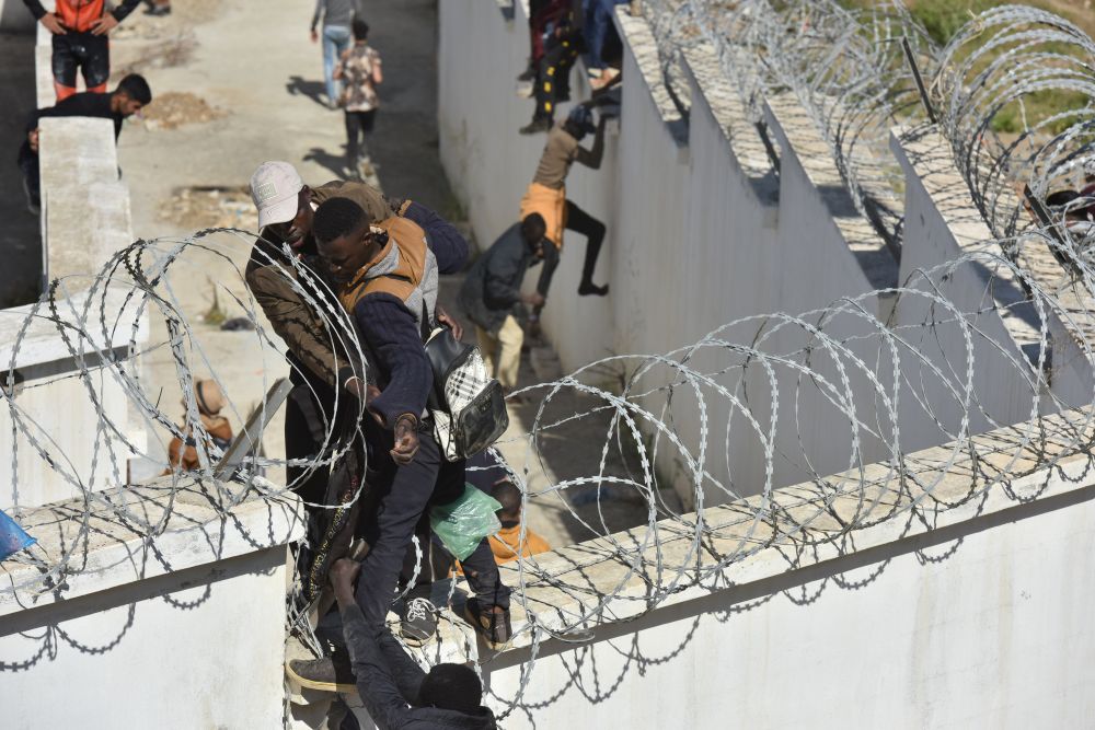 5月18日,人们从摩洛哥翻越边界围栏试图进入西班牙飞地休达。(新华社发)