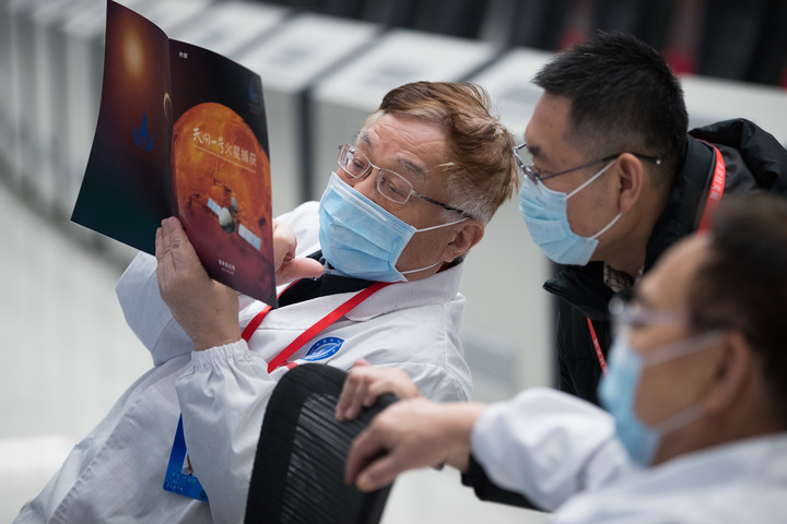2月10日,在北京航天飞行控制中心指挥大厅,中国航天科技集团五院技术顾问叶培建院士(左)和同事讨论。新华社记者金立旺摄