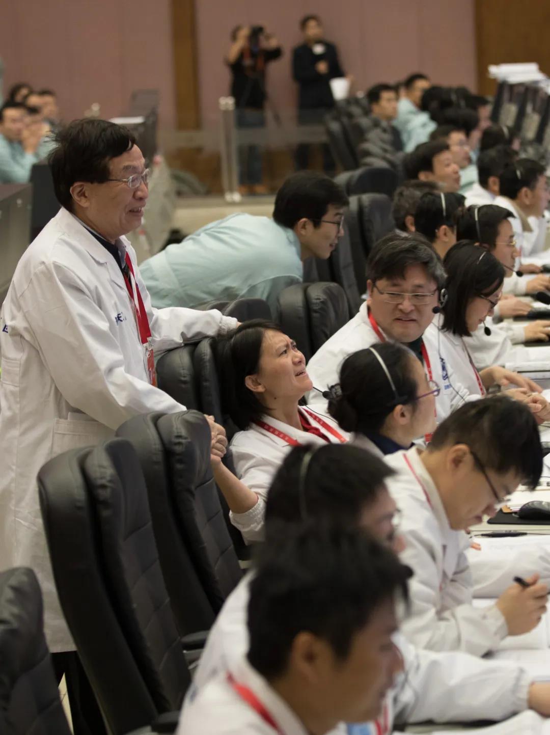 2019年1月3日,嫦娥四号成功落月的那一刻,叶培建院士(左一)静静走到嫦娥四号探测器项目执行总监张熇的身后,对她表示祝贺和鼓励。两代“嫦娥人”的手紧紧握在了一起。新华社记者金立旺摄