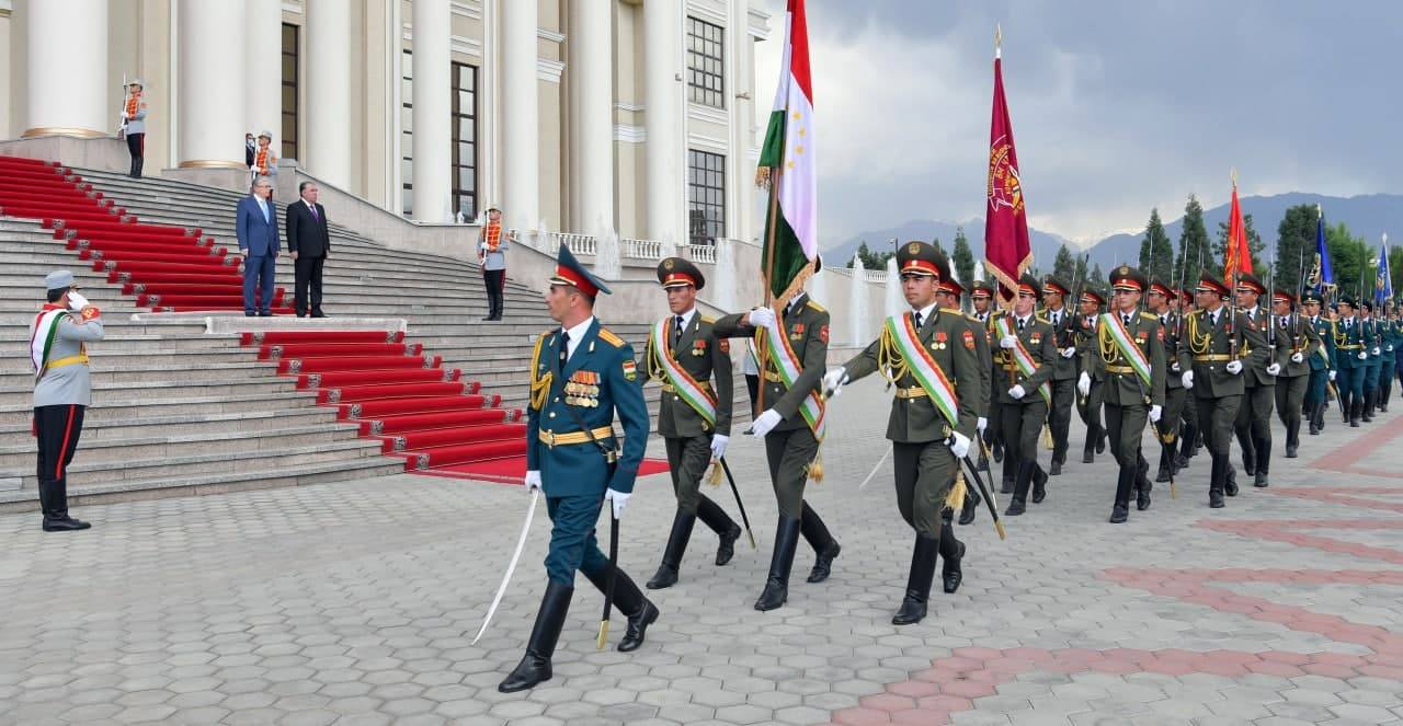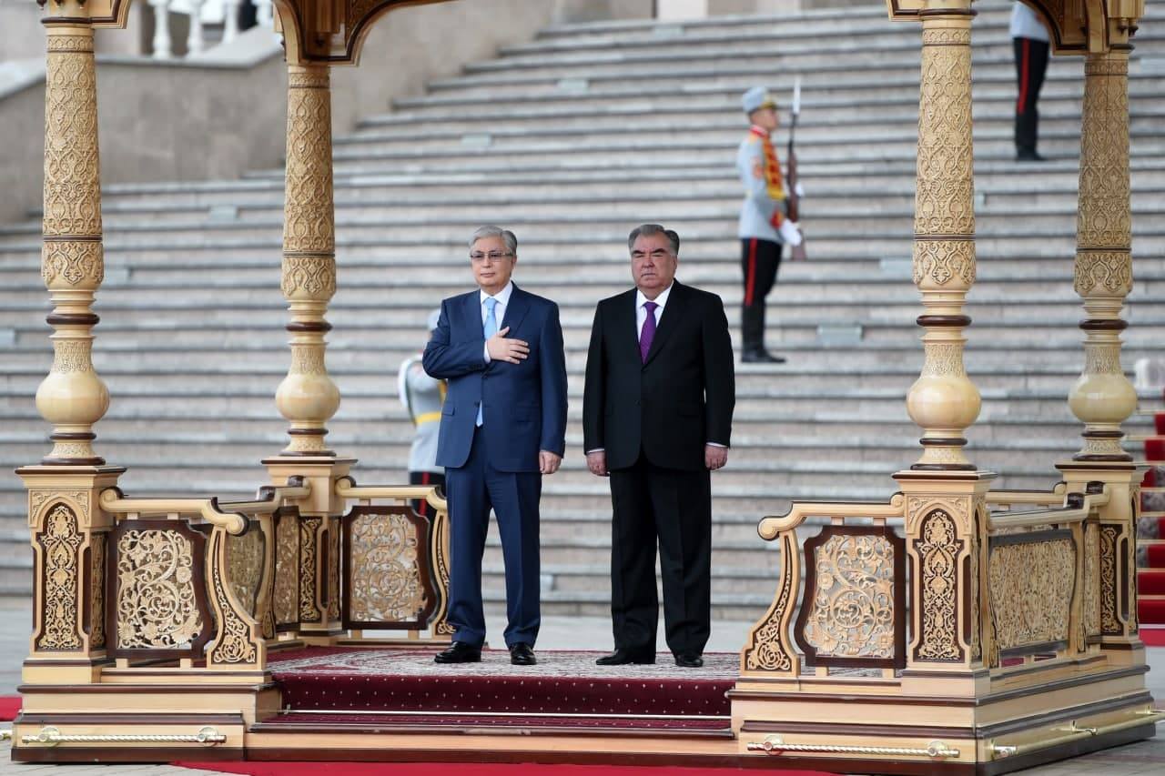 △塔吉克斯坦总统拉赫蒙(右)举行仪式欢迎托卡耶夫到访。图片来源:卫星通讯社。