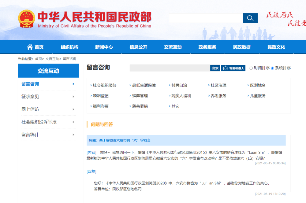 甚至,我们强大的网友也“咨询”了权威部门。有网友近日在民政部网站咨询关于安徽六安市的“六”字读音问题:根据《中华人民共和国行政区划简册2015》六安市的拼音为“Luan Shi”,那根据最新版“六”字发音有改动嘛?