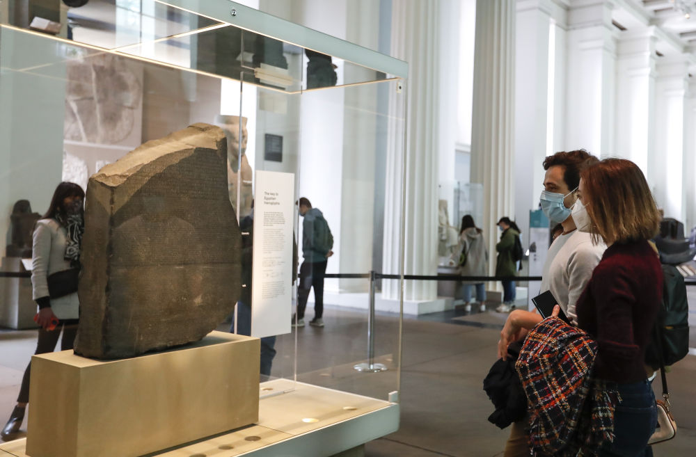 5月17日,参观者在英国伦敦的大英博物馆内观看罗塞塔石碑。因疫情关闭数月的大英博物馆当日重新开放。新华社记者韩岩摄