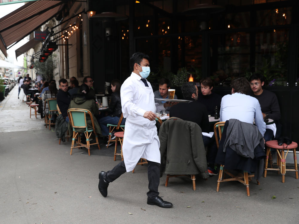 5月19日,服务生在法国巴黎一家餐厅工作。新华社记者高静摄