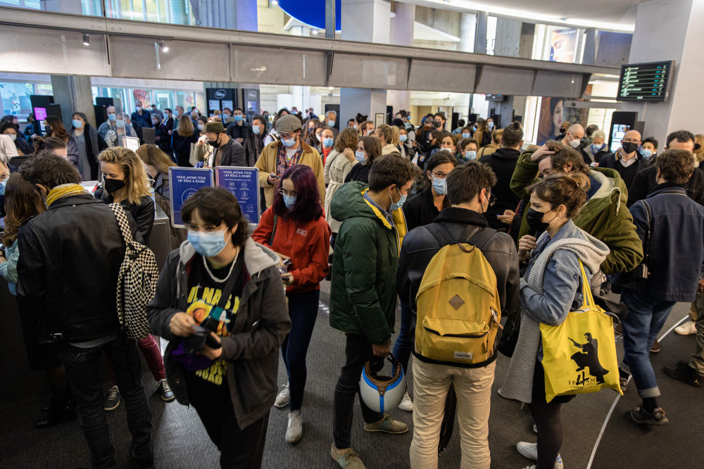 5月19日,人们来到法国巴黎一家重新营业的电影院。新华社发(奥雷利安·莫里萨尔摄)