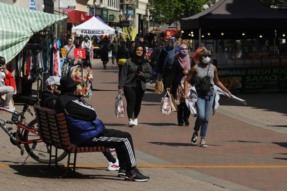 5月19日,人们走在英国贝德福德街头。新华社发(蒂姆·爱尔兰摄)
