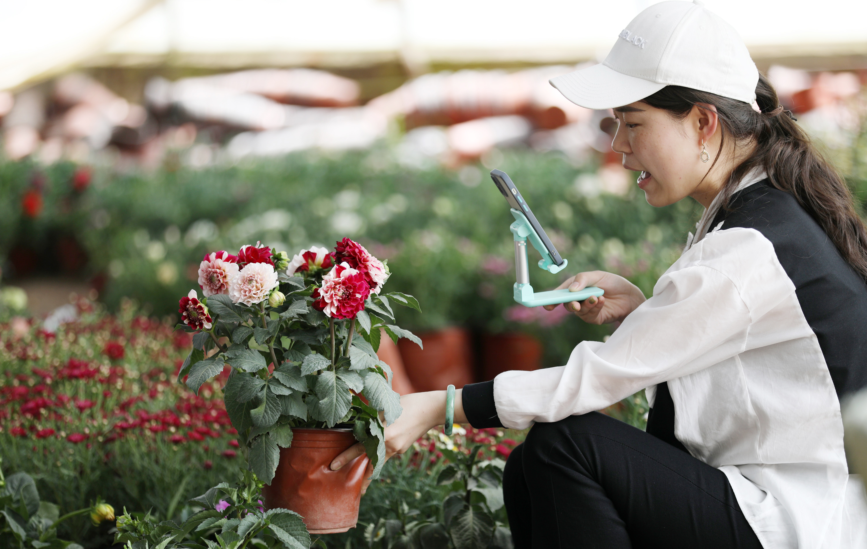 5月9日,山东郯城一个花卉基地,一名网络主播直播卖花。新华社发