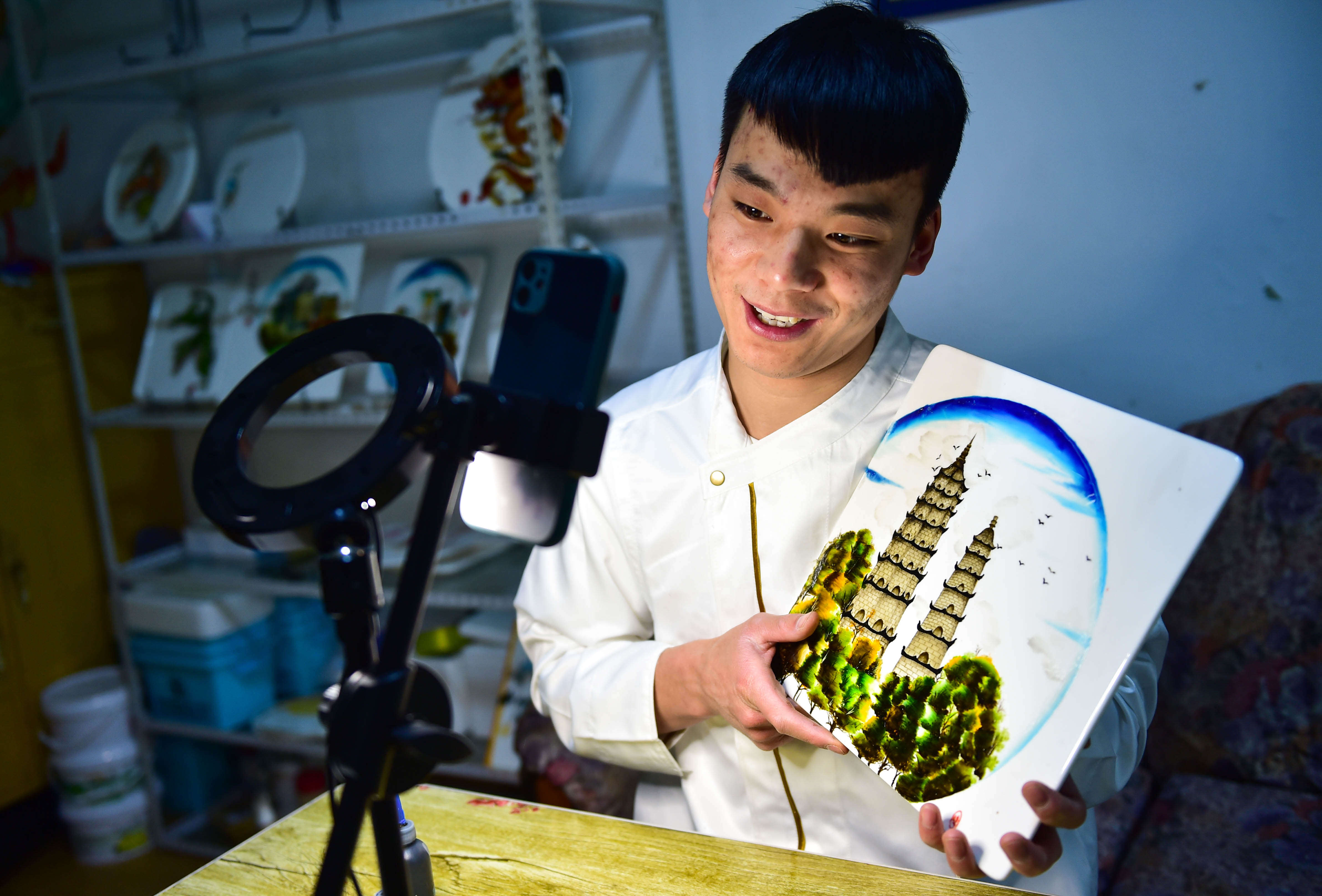 在一个艺术工作室,工作人员通过直播向网友介绍果酱画。新华社记者 柴婷 摄