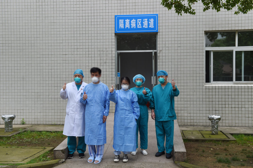 5月20日,在六安市人民医院东院区,解除医学观察的无症状感染者(左二)和出院的新冠肺炎确诊病例(左三)走出隔离病区后和医护人员合影。新华社记者 周牧 摄