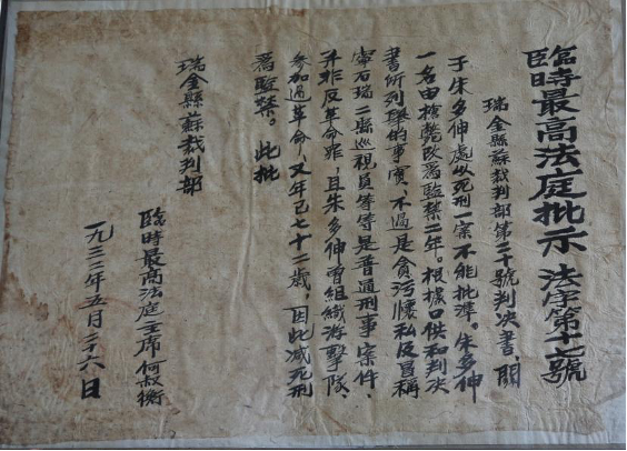 “关于朱多伸判处死刑一案不能批准。朱多伸一案由枪毙改为监禁二年……”5月14日,在中华苏维埃共和国最高法院旧址,一张1932年的法庭裁判文书吸引了“回望红色司法路 寻根溯源再出发”活动采访团的注意。由死刑改为监禁二年,一起中华苏维埃共和国临时最高法庭“刀下留人”的典型案例再次进入人们视线。