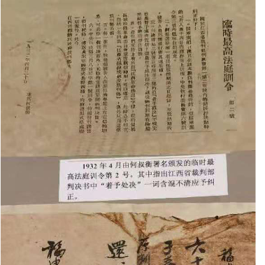 在中华苏维埃共和国最高法院旧址,采访团看到了墙上悬挂的1932年4月20日临时最高法庭发布的第二号训令。这是纠正江西省裁判部1932年第一次开庭审判反革命案件第一号、第二号判决书中错误和缺点的训令。对于以上两份判决书中存在的错误,临时最高法庭主席何叔衡一一给予纠正。比如,他在临时最高法庭第二号训令中指出:“判决书第二号中的‘着予处决’字样究竟是着予处决监禁?还是着予处决枪决?以后的判词应有极端明显性不能稍带含混性。”