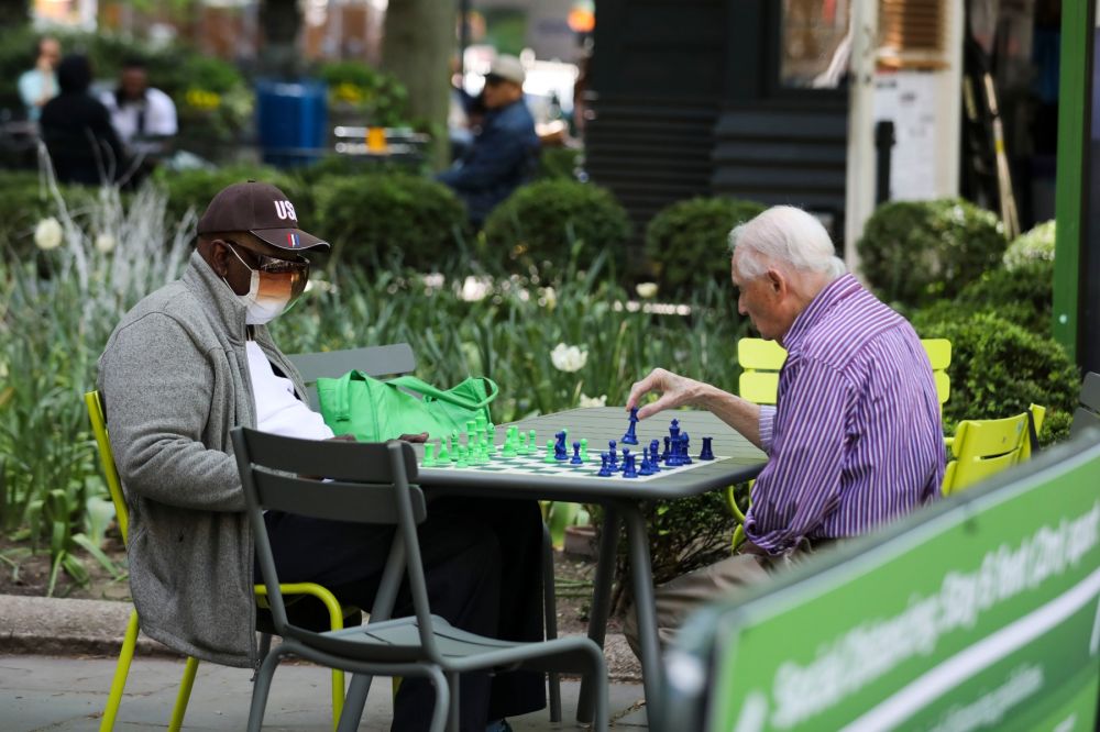 5月14日,两位老人在美国纽约布赖恩特公园下棋。(新华社记者王迎摄)