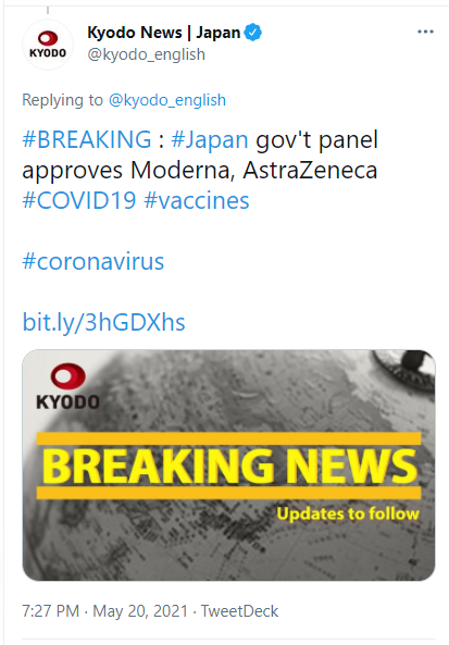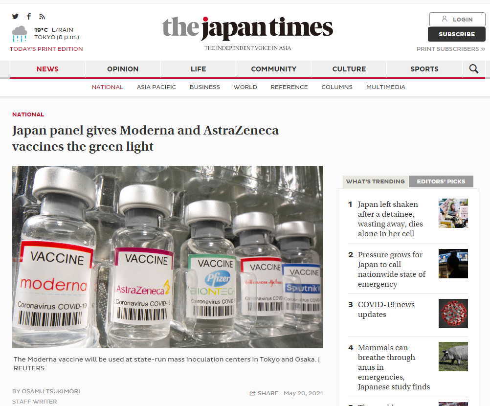 据共同社与《日本时报》报道,日本政府于5月20日通过了莫得纳和阿斯利康新冠疫苗的使用许可。