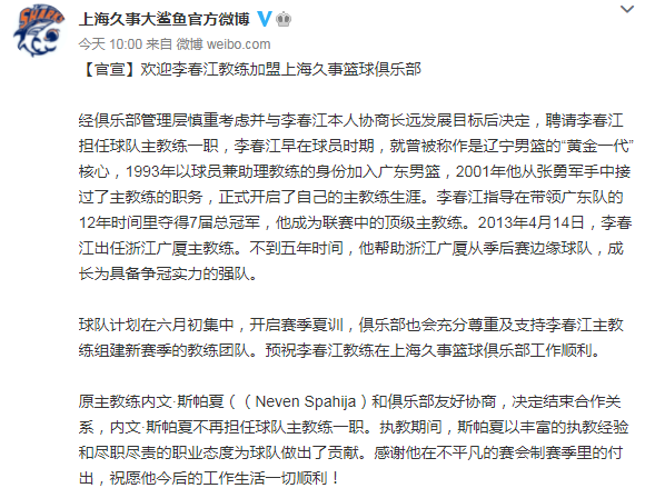 新华社上海5月20日电(记者 许东远、林德韧)记者20日从上海久事大鲨鱼官方微博获悉,上海久事大鲨鱼俱乐部已正式聘请李春江担任球队主教练一职。