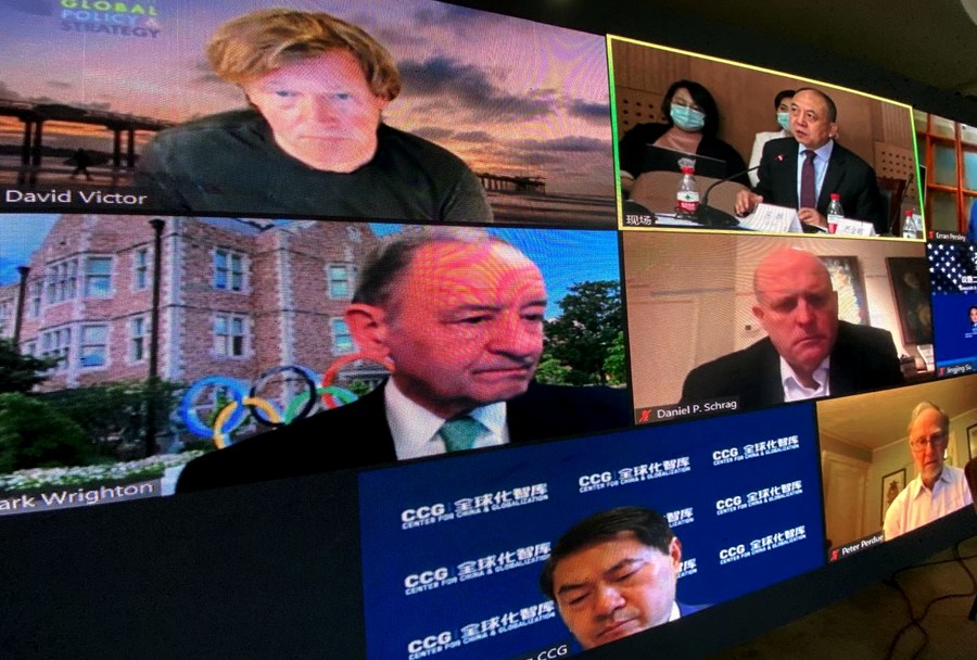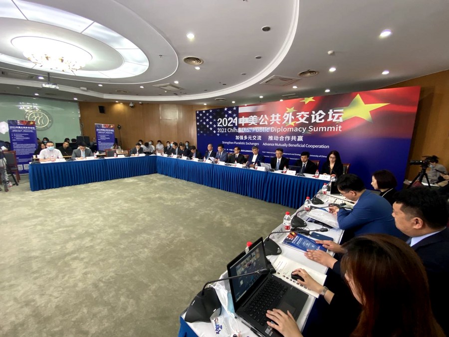 在中国人民大学举办的2021中美公共外交论坛上,中美专家通过视频对话交流。新华社记者魏梦佳摄