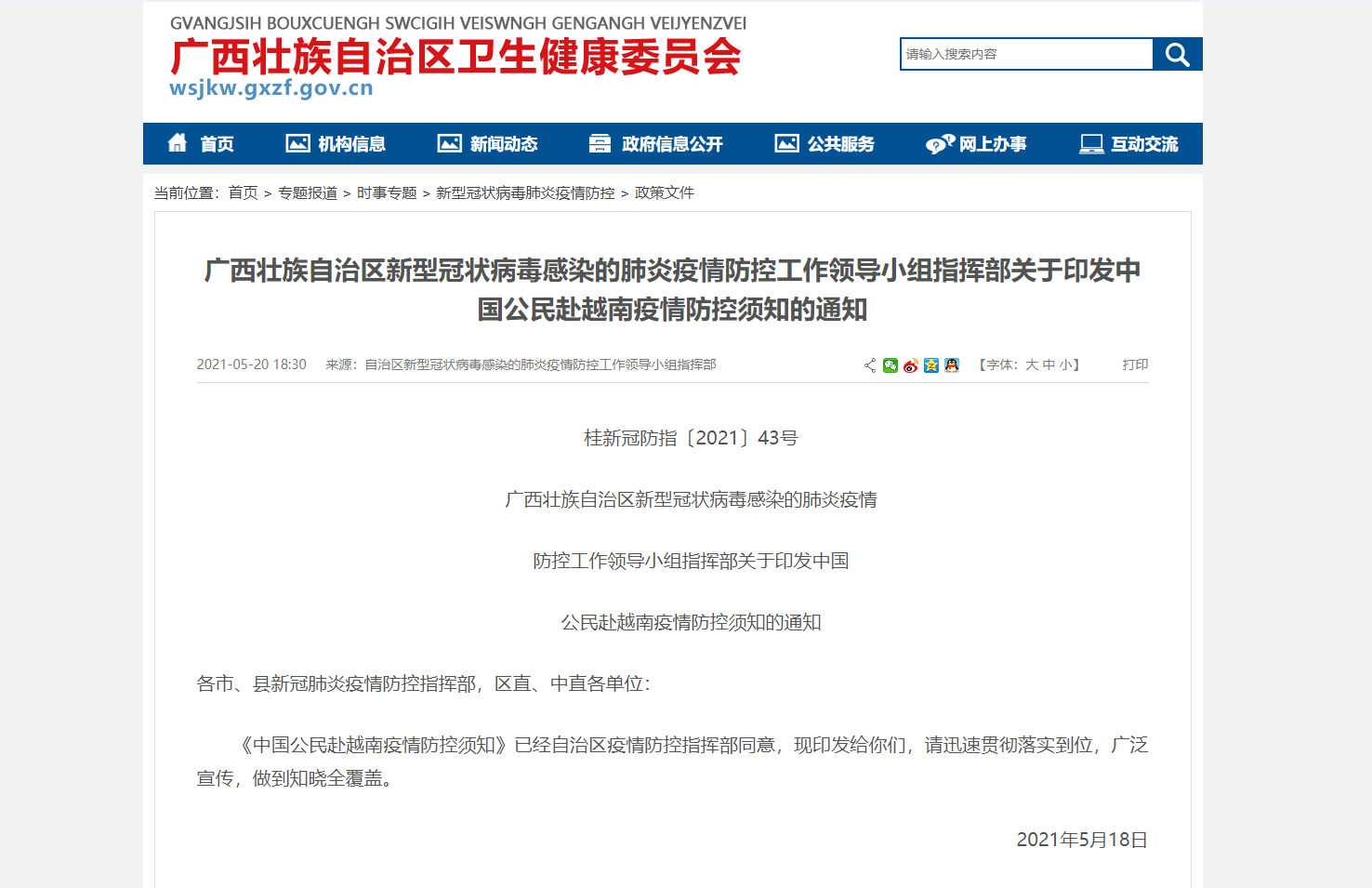 近日,广西壮族自治区新型冠状病毒感染的肺炎疫情防控工作领导小组指挥部印发了《中国公民赴越南疫情防控须知》,当前境外新冠疫情持续蔓延,中国境内不断出现境外输入病例,疫情防控形势严峻。为巩固来之不易的疫情防控成果,保障人民身体健康和生命安全,对近期赴越南的中国公民提示如下: