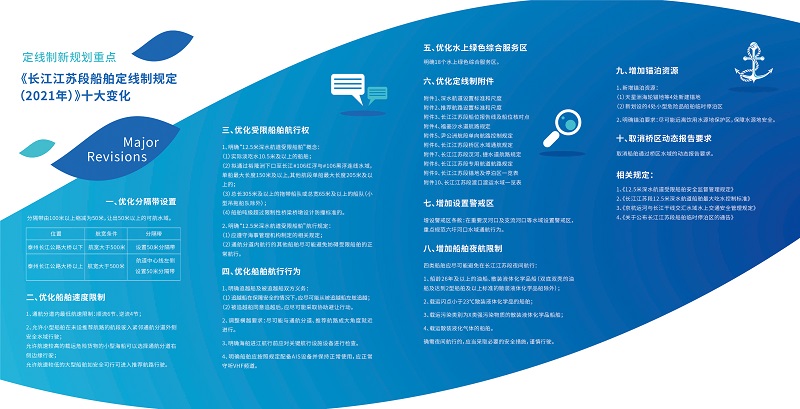 在航行规则优化方面,明确受限船舶航行权,进一步提升大型海轮航行条件。对船舶横越、追越等行为规范进行增补,在重要汊河口及支流河口等水域增设警戒区,对四类危险品船舶增加了夜航限制。