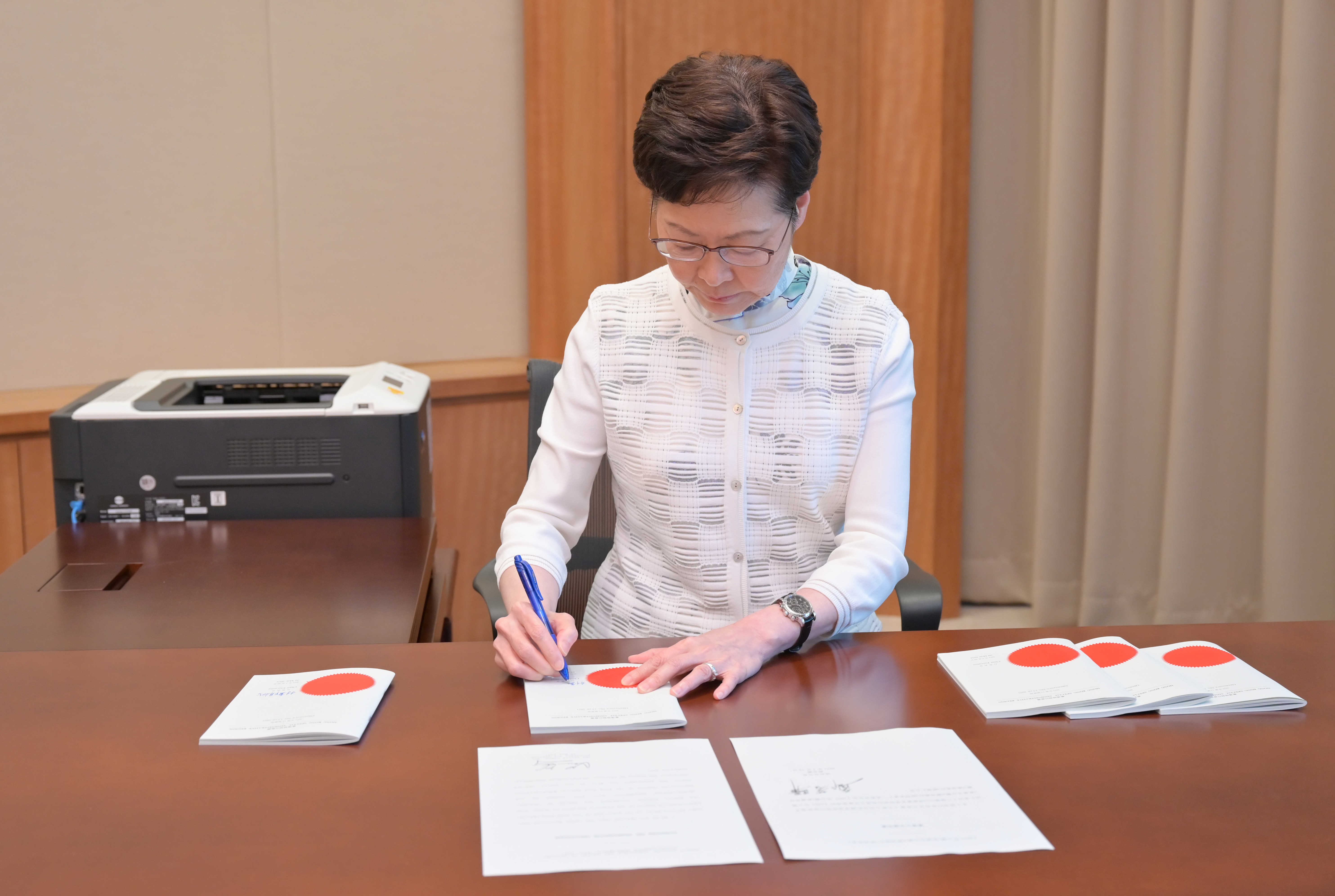 5月20日,香港特区行政长官林郑月娥根据香港基本法第四十八条第三款,签署经立法会通过的《2021年公职(参选及任职)(杂项修订)条例》。该条例将于21日刊宪公布,之后正式生效。新华社发