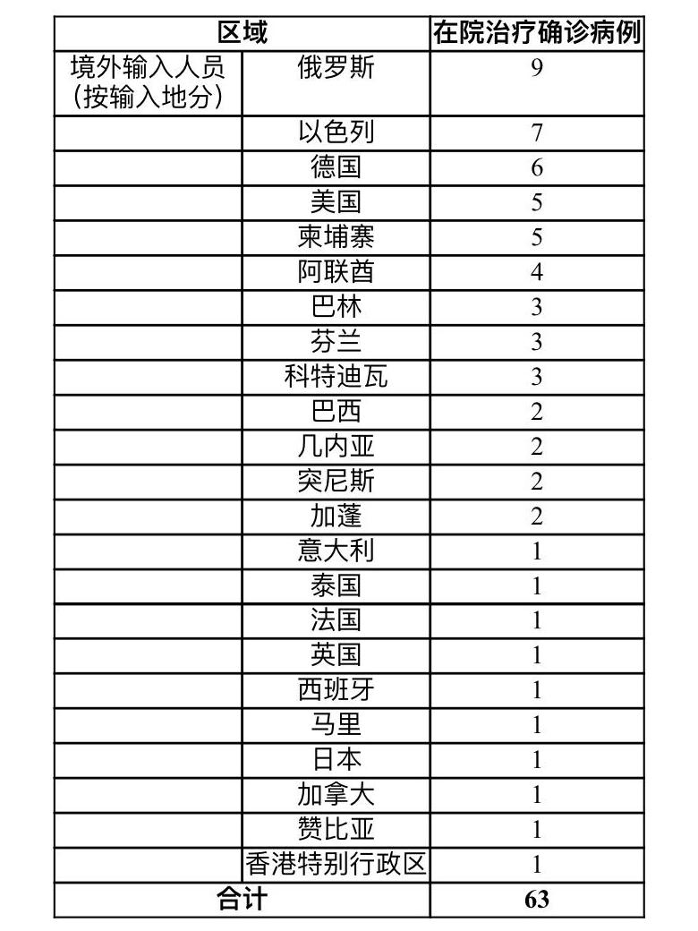 截至2021年5月20日24时,累计境外输入确诊病例1690例,出院1627例,在院治疗63例。现有待排查的疑似病例1例。