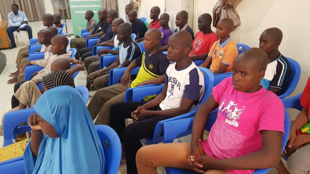 2019年10月3日,在尼日利亚博尔诺州首府迈杜古里,尼日利亚军方近期解救的儿童兵出席移交安置仪式。(新华社发,马卡马·苏勒摄)
