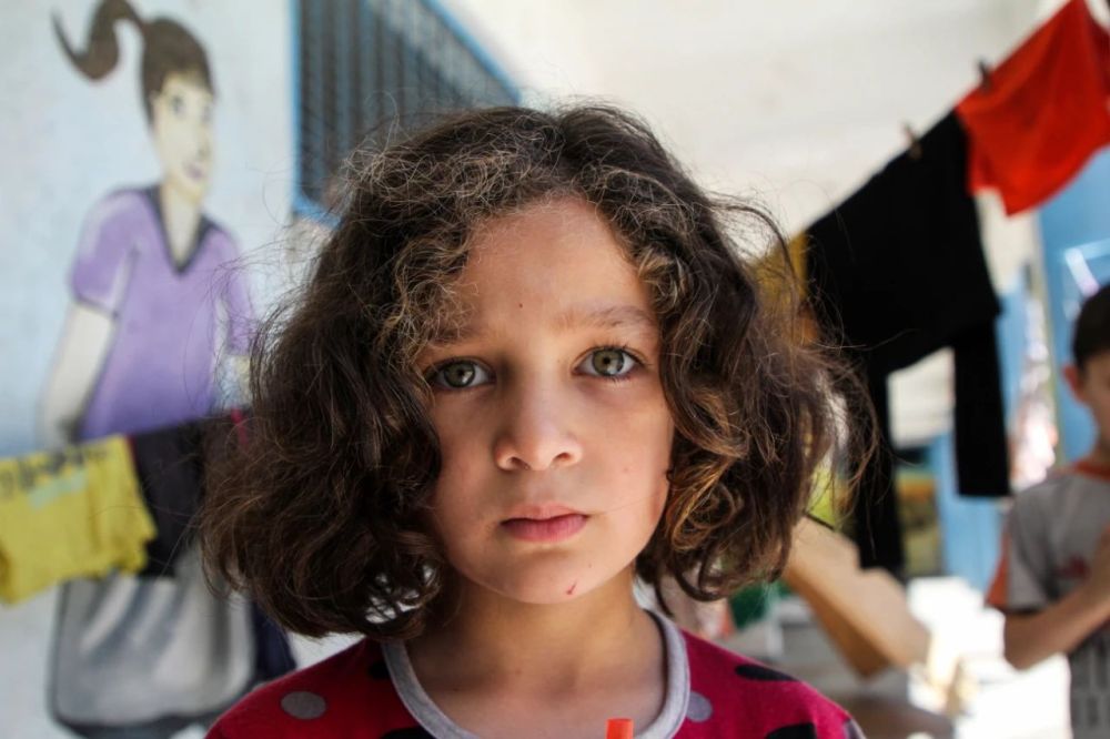 5月19日,受空袭影响而逃离家园的5岁巴勒斯坦儿童萨马·苏丹在加沙城一所学校临时栖身。新华社发(里泽克·阿卜杜勒·贾瓦德摄)