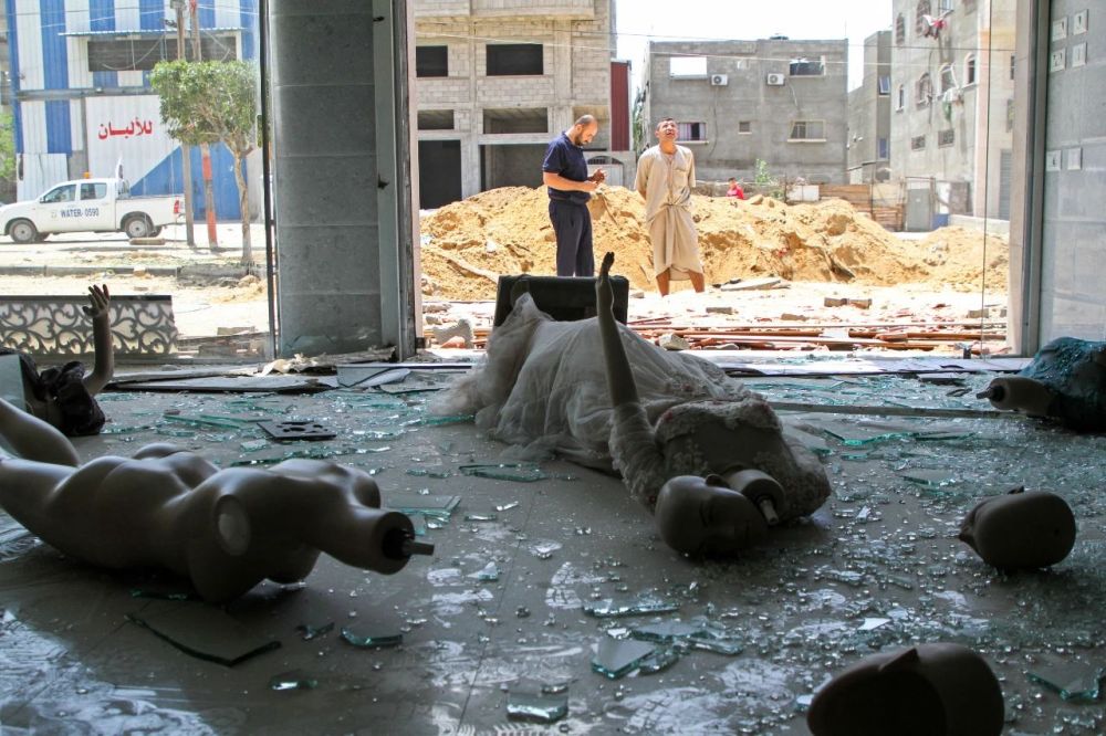 5月20日,巴勒斯坦人在加沙城查看遭以色列空袭损毁的店铺。新华社发(里泽克·阿卜杜勒·贾瓦德摄)