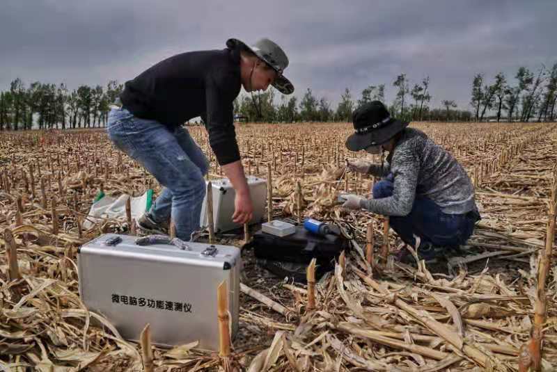 科研人员在试验田里测量数据(中科院科技摄影联盟供图)