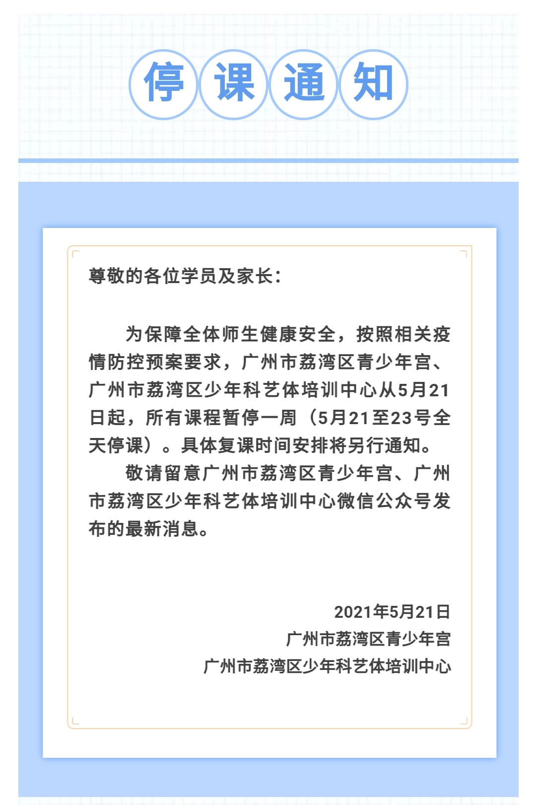 据广州市荔湾区青少年宫、广州市荔湾区少年科艺体培训中心微信公众号消息,为保障全体师生健康安全,按照相关疫情防控预案要求,广州市荔湾区青少年宫、广州市荔湾区少年科艺体培训中心从5月21日起,所有课程暂停一周(5月21至23日全天停课)。具体复课时间安排将另行通知。