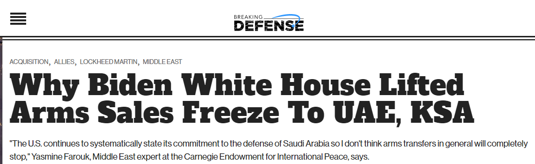 更讽刺的是美国对沙特的军售。据美国媒体报道,早在今年2月,拜登政府曾考虑停止向沙特转让进攻性武器,原因是担心沙特对也门的轰炸侵犯人权。