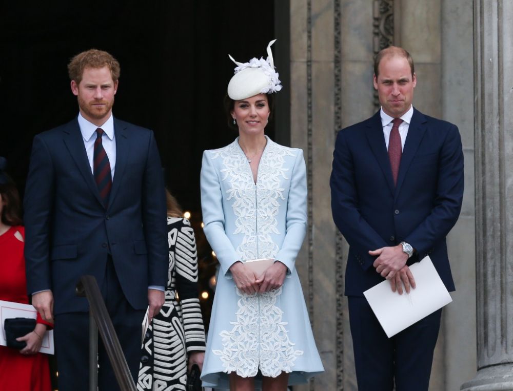 2016年6月10日,在英国伦敦,威廉王子(右)、凯特王妃(中)和哈里王子离开圣保罗大教堂。(新华社记者韩岩摄)