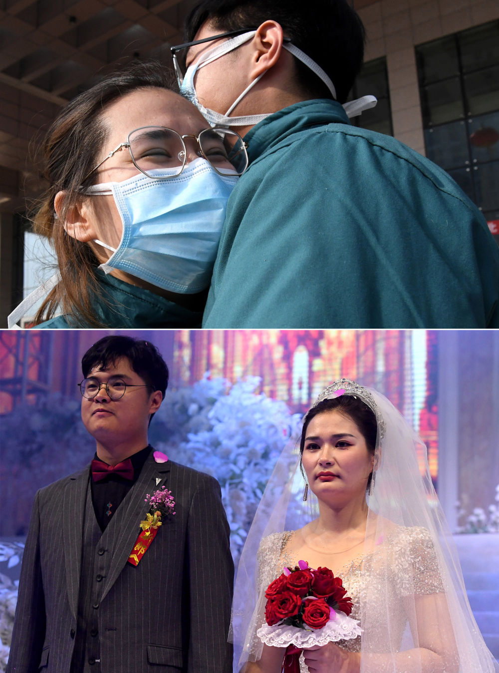 上图:刘光耀(右)和乔冰在出发去武汉前拥抱鼓劲(2020年2月2日摄);下图:刘光耀、乔冰在婚礼上(2021年5月20日摄)。