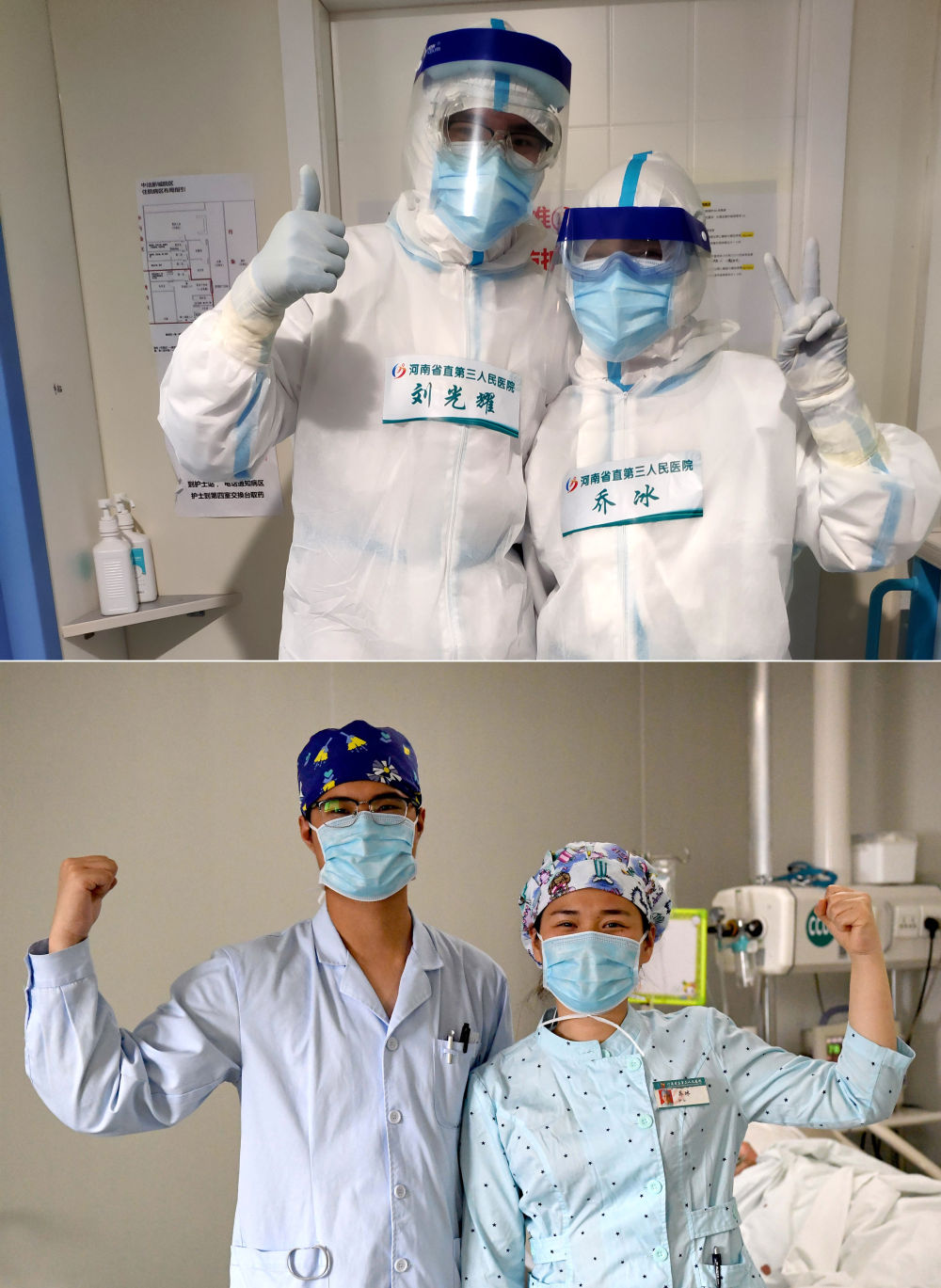 上图:刘光耀(左)和乔冰在武汉同济医院中法新城院区穿好防护服准备进入病区(资料照片,新华社发);下图:2020年4月26日,刘光耀(左)和乔冰在河南省直第三人民医院急重症医学中心病房内(新华社记者李安摄)。